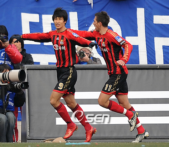 프로축구 챔피언을 가리는 '삼성 하우젠 K-리그 2008' 챔피언결정 2차전 수원삼성과 FC서울 경기가 7일 수원월드컵경기장에서 열렸다. 전반 25분 서울 정조국이 동점 페널티킥을 성공시킨 후 세리머니를 펼치고 있다./수원=민경훈 기자 rumi@osen.co.kr 온라인으로 받아보는 스포츠 신문, 디지털 무가지 OSEN Fun&Fun, 매일 3판 발행
