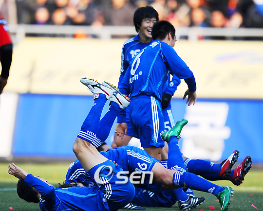 프로축구 챔피언을 가리는 '삼성 하우젠 K-리그 2008' 챔피언결정 2차전 수원삼성과 FC서울 경기가 7일 수원월드컵경기장에서 열렸다. 전반 36분 페널티킥이 서울 골키퍼 김호준에게 막힌 뒤 다시 차넣어 2-1을 만든 수원 송종국의 볼링 세리머니에 동료들이 넘어지고 있다./수원=민경훈 기자 rumi@osen.co.kr 온라인으로 받아보는 스포츠 신문, 디지털 무가지 OSEN Fun&Fun, 매일 3판 발행