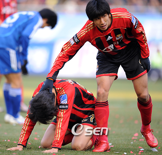 정조국(24, 서울)이 광대뼈 부상을 이겨내며 고군분투했지만 끝내 우승컵을 들어올리지 못했다. 정조국이 동점골을 터트렸지만 FC 서울은 전반 36분 송종국에 결승골을 내주면서 7일 수원월드컵경기장에서 열린 수원 삼성과의 삼성하우젠 K리그 2008 챔피언결정 2차전에서 1-2로 패해 우승트로피를 놓쳤다. 정조국은 서울로 연고지 이전 후 첫 우승을 위해 부지런히 그라운드를 누볐지만 끝내 골을 터트리지 못하며 후반 22분 김은중과 교체됐다. 정조국은 전반 23분 경 이청용이 얻은 페널티킥을 성공시켜 1-1 동점을 만들었다. 서울은 중앙선에서 길게 올라온 크로스를 이청용이 받아 페널티지역 안쪽에서 빠져나가려 할 때 이운재 골키퍼가 손으로 진로를 막으면서 페널티킥을 얻은 것이다. 정조국은 동료가 얻은 동점 기회를 팀의 스트라이커로서 놓치지 않고 침착하게 골로 연결시켰다. 정조국은 지난 달 30일 서울월드컵경기장에서 열린 울산과의 플레이오프서 희생정신을 보여주며 4-2 대승을 이끈 바 있다. 정조국은 정규리그서 공중볼다툰 도중 광대뼈가 함몰되는 큰 부상을 입고 치료와 훈련을 병행했다. 울산전에서 마스크를 쓰고 출전할 것으로 예상됐지만 정조국은 플레이에 방해가 될 것으로 판단, 부상 위험을 무릎 쓰고도 마스크를 벗고 출전했다. 그의 정신력은 결국 이 날 전반 26분 선제골을 뽑아내는 걸로 연결됐고 서울은 이 날 연장에만 3골을 몰아 넣으며 수원이 기다리는 챔피언결정전행을 확정지었다. 하지만 120분 혈투를 펼치고 3일 만에 지난 3일 챔피언결정 1차전을 치른 정조국은 다소 부진한 모습이었다. 슈팅을 하나도 기록하지 못할 만큼 떨어진 체력을 회복하지 못했다. 그러나 2차전에서 정조국은 페널티킥골을 성공시키며 수원을 추격할 발판을 만들었다. 후반 들어 정조국은 슈팅을 시도했지만 강도가 약해 이운재 골키퍼 품에 안기기도 했다. 1-2로 뒤진 상황에서 전세를 역전시키기 위해 고군분투했지만 정조국은 끝내 동점골을 터트리지 못한 채 후반 22분 김은중과 교체됐다. 청소년대표를 거쳐 엘리트 코스를 마친 정조국은 지난 2003년 입단해 데뷔 첫 해 12골을 터트리며 신인왕에 올랐지만 단 하나 우승트로피를 품 안에 안지 못하며 다음 시즌을 기약하게 됐다. 7rhdwn@osen.co.kr 온라인으로 받아보는 스포츠 신문, 디지털 무가지 OSEN Fun&Fun, 매일 3판 발행