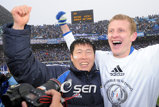프로축구 챔피언을 가리는 '삼성 하우젠 K-리그 2008' 챔피언결정 2차전 수원삼성과 FC 서울 경기가 7일 수원월드컵경기장에서 열려 수원 삼성이 2-1로 승리 4번째 별을 가슴에 달게 됐다.수원 차범근 감독과 마토가 승리의 환호를 하고 있다./수원=윤민호 기자ymh@osen.co.kr 온라인으로 받아보는 스포츠 신문, 디지털 무가지 OSEN Fun&Fun, 매일 3판 발행