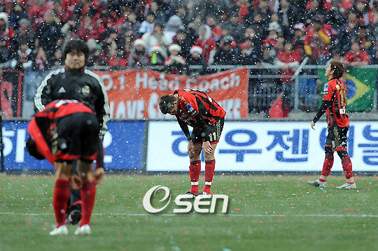 프로축구 챔피언을 가리는 '삼성 하우젠 K-리그 2008' 챔피언결정 2차전 수원삼성과 FC 서울 경기가 7일 수원월드컵경기장에서 열려 수원 삼성이 2-1로 승리 4번째 별을 가슴에 달게 됐다.패한 서울 선수들이 그라운드에서 아쉬워하고 있다./수원=윤민호 기자ymh@osen.co.kr 온라인으로 받아보는 스포츠 신문, 디지털 무가지 OSEN Fun&Fun, 매일 3판 발행