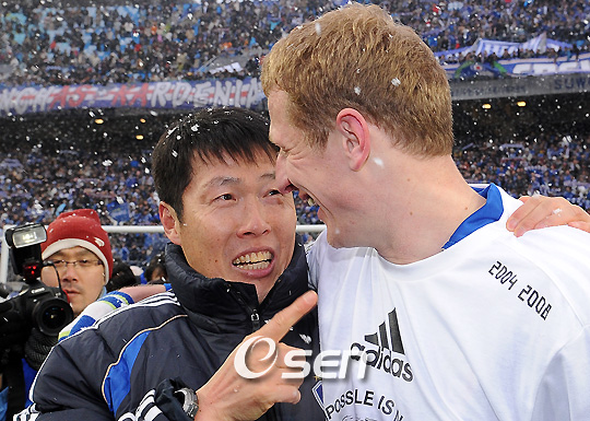 프로축구 챔피언을 가리는 '삼성 하우젠 K-리그 2008' 챔피언결정 2차전 수원삼성과 FC 서울 경기가 7일 수원월드컵경기장에서 열려 수원 삼성이 2-1로 승리 4번째 별을 가슴에 달게 됐다. 수원 차범근 감독과 마토가 승리의 기쁨을 나누고 있다./수원=윤민호 기자ymh@osen.co.kr 온라인으로 받아보는 스포츠 신문, 디지털 무가지 OSEN Fun&Fun, 매일 3판 발행