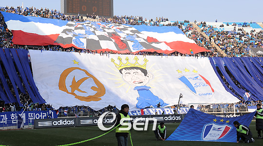 프로축구 챔피언을 가리는 '삼성 하우젠 K-리그 2008' 챔피언결정 2차전 수원삼성과 FC서울 경기가 7일 수원월드컵경기장에서 열렸다. 경기 전 수원 서포터즈가 차범근 감독의 얼굴이 그려진 대형 천을 이용, 응원을 펼치고 있다./수원=윤민호 기자ymh@osen.co.kr 온라인으로 받아보는 스포츠 신문, 디지털 무가지 OSEN Fun&Fun, 매일 3판 발행