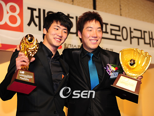 전통을 자랑하는 '2008 제일화재 프로야구대상 시상식'이 로이스터 감독을 제외한 7개구단 감독과 수상자들 각 구단 관계자들이 참석한 가운데 8일 오전 프라자 호텔에서 벌어졌다. 대상을 수상한 두산 김현수와 최고투수상을 수상한 SK 김광현이 밝은 표정으로 포토타임을 갖고 있다./손용호 기자spjj@osen.co.kr 온라인으로 받아보는 스포츠 신문, 디지털 무가지 OSEN Fun&Fun, 매일 3판 발행