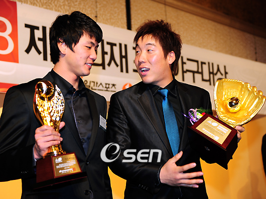 전통을 자랑하는 '2008 제일화재 프로야구대상 시상식'이 로이스터 감독을 제외한 7개구단 감독과 수상자들 각 구단 관계자들이 참석한 가운데 8일 오전 프라자 호텔에서 벌어졌다. 대상을 수상한 두산 김현수와 최고투수상을 수상한 SK 김광현이 밝은 표정으로 포토타임을 갖고 있다./손용호 기자spjj@osen.co.kr osen.co.kr/news/Sports_View.asp?gisano=G0812080059" style="text-decoration:none" target="_blank" name="LinkGubun"> [사진]동갑내기 최고타자 최고투수 김현수와 김광현온라인으로 받아보는 스포츠 신문, 디지털 무가지 OSEN Fun&Fun, 매일 3판 발행