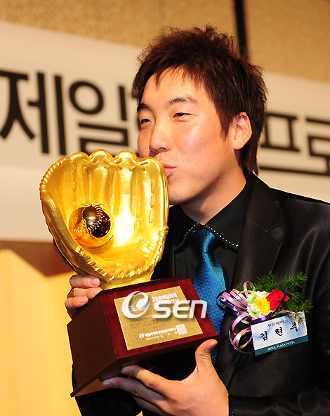 전통을 자랑하는 '2008 제일화재 프로야구대상 시상식'이 로이스터 감독을 제외한 7개구단 감독과 수상자들 각 구단 관계자들이 참석한 가운데 8일 오전 프라자 호텔에서 벌어졌다. 대상을 수상한 두산 김현수가 트로피에 키스를 하고 있다./손용호 기자spjj@osen.co.kr osen.co.kr/news/Sports_View.asp?gisano=G0812080059" style="text-decoration:none" target="_blank" name="LinkGubun"> [사진]동갑내기 최고타자 최고투수 김현수와 김광현온라인으로 받아보는 스포츠 신문, 디지털 무가지 OSEN Fun&Fun, 매일 3판 발행