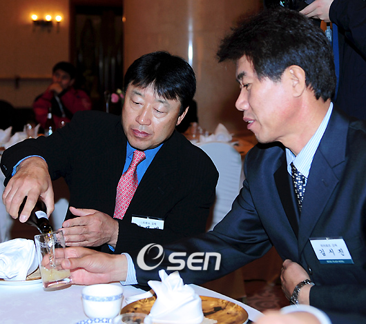전통을 자랑하는 '2008 제일화재 프로야구대상 시상식'이 로이스터 감독을 제외한 7개구단 감독과 수상자들 각 구단 관계자들이 참석한 가운데 8일 오전 프라자 호텔에서 벌어졌다. 시상식이 끝나고 건배 시간때 김재박 LG 감독이 히어로즈 김시진 감독에게 술을 따르고 있다./손용호 기자spjj@osen.co.kr 온라인으로 받아보는 스포츠 신문, 디지털 무가지 OSEN Fun&Fun, 매일 3판 발행