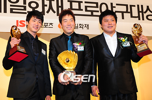 김현수(20. 두산 베어스)가 김광현(20. SK), 김태균(26. 한화)을 제치고 2008 제일화재 프로야구 대상의 영광을 안았다. 김현수는 8일 서울 프라자 호텔 별관 지하 2층 그랜드 볼룸에서 열리고 일간 스포츠와 제일화재 해상보험(주)이 공동 제정한 '2008 제일화재 프로야구 대상'서 대상의 영예를 안았다. 올시즌 3할5푼7리(1위) 9홈런 89타점(5위)을 올리며 두산의 2년 연속 한국 시리즈 진출을 이끈 김현수는 순금 도금 글러브 및 상금 1000만원을 받았다. 올시즌 16승(1위) 4패 평균 자책점 2.39(2위)를 기록한 SK의 좌완 에이스 김광현은 최고 투수상을 받았으며 3할2푼4리(5위) 31홈런(1위) 92타점(4위)으로 다이너마이트 타선의 뇌관 역할을 해낸 김태균은 최고 타자상을 수상했다. 또한 국내 최고의 마무리로 평가 받는 오승환(26. 삼성)은 최고 구원상의 영광을 차지했다. 세 선수는 상금 300만원과 함께 트로피를 수상했다. 2008 신인왕 최형우(25. 삼성)는 신인상의 주인공으로 꼽히며 대단한 상복을 과시했고 프로 감독상 수상자로는 SK의 2년 연속 한국시리즈 제패를 이끈 김성근 감독이 뽑혔으며 베이징 올림픽 금메달을 이끈 김경문 두산 감독과 히어로즈의 베테랑 전준호(39)는 특별상의 영예를 안았다. 2008 제일화재 프로야구 대상 수상자 명단 대상-김현수(두산) 최고 투수상-김광현(SK) 최고 타자상-김태균(한화) 최고 구원상-오승환(삼성) 프로 감독상-김성근(SK) 신인상-최형우(삼성) 재기상-윤석민(KIA) 기량 발전상-안치용(LG) 특별상-김경문(두산 감독), 전준호(히어로즈) 프런트상-롯데 마케팅팀 심판상-문승훈 심판위원 아마추어 지도자상-정윤진(덕수고 감독) 아마추어 MVP-정인욱(대구고, 삼성 입단 예정) sun@osen.co.kr '2008 제일화재 프로야구대상 시상식'이 로이스터 감독을 제외한 7개구단 감독과 수상자들 각 구단 관계자들이 참석한 가운데 8일 오전 프라자 호텔에서 벌어졌다. 대상을 수상한 두산 김현수와 최고투수상을 수상한 SK 김광현 최고타자상을 수상한 김태균이 밝은 표정으로 포토타임을 갖고 있다./손용호 기자spjj@osen.co.kr 온라인으로 받아보는 스포츠 신문, 디지털 무가지 OSEN Fun&Fun, 매일 3판 발행