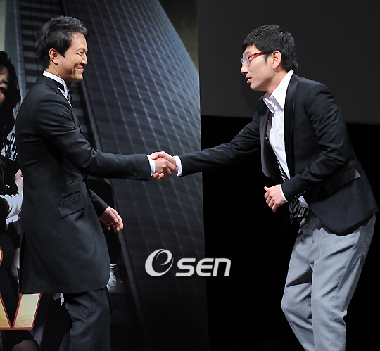 액션 코미디 영화 '유감스러운 도시' 제작보고회가 9일 서울 압구정 CGV에서 열렸다. 이 자리에는 김동원 감독과 주연배우 정준호 정웅인 김상중 박상민 김대희가 참석했다. 늦게 회견장에 도착한 정운택을 정웅인이 반갑게 맞이하고 있다./민경훈 기자rumi@osen.co.kr 온라인으로 받아보는 스포츠 신문, 디지털 무가지 OSEN Fun&Fun, 매일 3판 발행