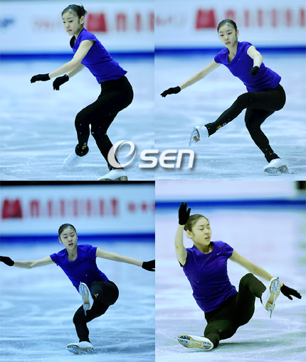 오는 12일 고양시 어울림누리 얼음마루에서 개막되는 2008~2009시즌 ISU(국제빙상경기연맹) 그랑프리 파이널 3연패에 도전하는 김연아(18.군포 수리고)가 경기를 앞두고 11일 적응 훈련을 가졌다. 김연아가 점프를 한뒤 착지 동작에서 넘어지고 있다./고양=김영민 기자ajyoung@osen,co,kr 온라인으로 받아보는 스포츠 신문, 디지털 무가지 OSEN Fun&Fun, 매일 3판 발행