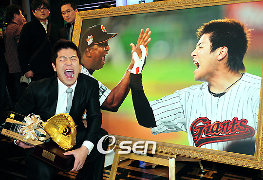 2008 프로야구 각 포지션별 최고의 선수를 가리는 '2008 골든글러브시상식'이 11일 프로야구 선수와 관계자들이 참석한 가운데 코엑스에서 열렸다. 골든포토상을 수상한 강민호가 본인의 포효하는 사진 앞에서 같은 포즈를 취하고 있다./윤민호 기자ymh@osen.co.kr 온라인으로 받아보는 스포츠 신문, 디지털 무가지 OSEN Fun&Fun, 매일 3판 발행