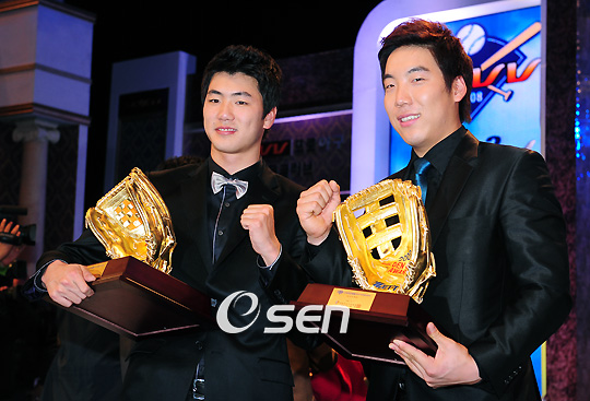 2008 프로야구 각 포지션별 최고의 선수를 가리는 '2008 골든글러브시상식'이 11일 프로야구 선수와 관계자들이 참석한 가운데 코엑스에서 열렸다. 투수 부문을 수상한 SK 김광현과 외야수 부문 두산 김현수가 기념촬영을 하고 있다./윤민호 기자ymh@osen.co.kr 온라인으로 받아보는 스포츠 신문, 디지털 무가지 OSEN Fun&Fun, 매일 3판 발행