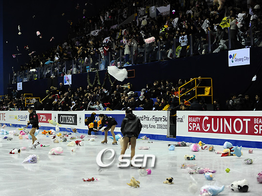 2008~2009시즌 ISU(국제빙상경기연맹) 그랑프리 파이널 경기가 12일 고양시 어울림누리 얼음마루에서 개막돼 김연아(18ㆍ군포 수리고)가 그랑프리 파이널 3연패에 도전한다. 김연아가 쇼트 프로그램에서 경기를 마친 후 팬들로부터 인형 세례을 받고 있다./고양=김영민 기자ajyoung@osen,co,kr 온라인으로 받아보는 스포츠 신문, 디지털 무가지 OSEN Fun&Fun, 매일 3판 발행