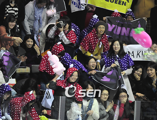 2008~2009시즌 ISU(국제빙상경기연맹) 그랑프리 파이널 경기가 12일 고양시 어울림누리 얼음마루에서 개막돼 김연아(18ㆍ군포 수리고)가 그랑프리 파이널 3연패에 도전한다. 여자 싱글 쇼트 프로그램에서 1위를 차지한 김연아가 연기를 마친 뒤 팬들이 인형을 던져주고 있다./고양=손용호 기자spjj@osen.co.kr 온라인으로 받아보는 스포츠 신문, 디지털 무가지 OSEN Fun&Fun, 매일 3판 발행