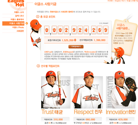 한화 이글스가 선행구단으로 거듭나고 있다. 15일 현재 한화 구단 홈페이지(http://www.hanwhaeagles.co.kr) '독수리 자유마당'에는 '이글스 사랑기금' 300만 포인트 돌파를 위한 한화팬들의 포인트 기부가 줄을 잇고 있다. 사회공헌 활동의 일환으로 작년부터 실시하고 있는 '이글스 사랑기금'은 한화를 대표하는 김태균, 송진우, 류현진의 적립 포인트와 회원이 기부한 포인트로 구성된다. 300만 포인트를 돌파하면 구단이 후원하고 있는 '평화의 마을'에 야구용품을 지원하게 된다. 김태균은 홈런 31개로 31만 포인트, 송진우는 132이닝을 던져 66만 포인트, 류현진은 143개의 삼진으로 42만9000포인트를 각각 적립했다. 또 회원 포인트는 회원 개인의 야구장 및 홈페이지 방문실적에 따라 적립되고 있다. 한화 홈피 회원들은 포인트를 쌓아 구단 기념품을 무료로 구입할 수 있다. 그러나 최근 회원들 사이에는 기부를 통해 후원 기관의 어린이들에게 야구용품을 전달하자는 릴레이 운동이 자발적으로 전개돼 구단관계자들의 마음을 훈훈하게 하고 있다. 현재까지 이글스 사랑기금은 292만점으로 300만점 돌파까지 약 8만점을 남겨둔 상태다. 한화 선수단은 이웃사랑의 공로를 인정받아 지난 11일 열린 골든글러브 시상식에서 '사랑의 골든글러브'를 수상했고 김태균은 2008 스포츠토토 올해의 상 시상식에서 선행상을 받은 바 있다. letmeout@osen.co.kr 한화 이글스 홈페이지. 온라인으로 받아보는 스포츠 신문, 디지털 무가지 OSEN Fun&Fun, 매일 3판 발행