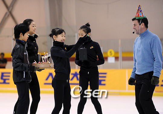 제2의 김연아 꿈나무 프로젝트 캠페인 전달식 및 피겨 클리닉 행사가 16일 고려대 아이스링크에서 열렸다. 김연아가 클리닉을 마친 뒤 오는 18일 만 47세 생일을 맞는 브라이언 오서 코치에게 꿈나무들과 생일 케이크를 전달하며 축하해주고 있다./김영민 기자ajyoung@osen.co.kr 온라인으로 받아보는 스포츠 신문, 디지털 무가지 OSEN Fun&Fun, 매일 3판 발행
