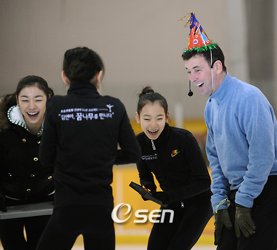 제2의 김연아 꿈나무 프로젝트 캠페인 전달식 및 피겨 클리닉 행사가 16일 고려대 아이스링크에서 열렸다. 오는 18일 만 47세 생일을 맞는 브라이언 오서 코치가 김연아로부터 축하 케이크를 받으면서 꿈나무들이 터뜨린 폭죽 소리에 깜짝 놀란 표정을 지은 뒤 웃고 있다./김영민 기자ajyoung@osen.co.kr 온라인으로 받아보는 스포츠 신문, 디지털 무가지 OSEN Fun&Fun, 매일 3판 발행