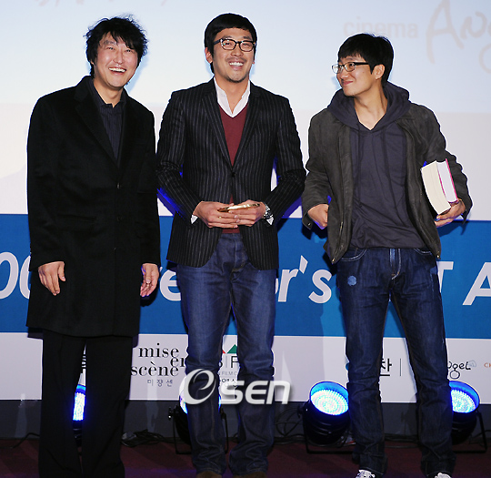 올해 각종 영화상의 대미를 장식할 마지막 영화상인 제11회 '디렉터스 컷 어워드(Director’s CUT Awards)'시상식이 16일 오후 서울 강남구 압구정 CGV에서 열렸다. 1998년 이현승 감독의 제안으로 시작돼 11회를 맞는 디렉터스 컷 시상식은 현재 활발히 활동하고 있는 영화감독들의 투표를 통해 수상자와 수상작이 결정된다. 올해는 100편의 작품을 대상으로 200여명 영화감독들의 투표로 이루어졌다. 송강호가 시네마 엔젤 감사패를 하정우와 박해일에게 전달한 후 환하게 미소짓고 있다./민경훈 기자 rumi@osen.co.kr 온라인으로 받아보는 스포츠 신문, 디지털 무가지 OSEN Fun&Fun, 매일 3판 발행