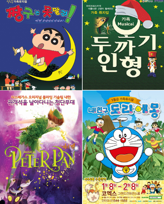 어른 아이 막론하고 꾸준히 사랑 받아온 만화 속 인기캐릭터와 동화 속 주인공들이 뮤지컬 무대에 오른다. 겨울 방학을 맞이한 우리 아이들에게 동심의 주인공들이 선사하는 마법 같은 공연을 온가족이 함께 즐겨보는 건 어떨까? 명랑가족 뮤지컬 ‘짱구는 못 말려-아라비안나이트’ 내년 1월 3일 무대에 오르는 명랑가족뮤지컬 ‘짱구는 못 말려-아라비안나이트’는 만화 속 ‘짱구’가 뮤지컬 주인공이 되어 재치있는 매력을 발산한다. 15년이 넘도록 꾸준한 인기를 유지하고 있는 짱구네 가족의 유별난 이야기를 아라비안나이트 내용과 접목해 제작한 뮤지컬이다. 재미난 에피소드와 신나는 모험을 펼치는 짱구네 가족 캐릭터는 뮤지컬 무대에서 코믹한 웃음을 선사한다. 뮤지컬 ‘짱구는 못 말려-아라비안나이트’(연출 이광열, 제작 극단 예일)에서는 짱구가 다니는 유치원에 일일 교사가 되는 짱구엄마의 변화된 캐릭터를 볼 수 있다. 짱구엄마는 짱구와 아이들의 편식습관을 고쳐주기 위해 일일교사가 되어 비타민 송을 가르쳐 주기도 하고 연극놀이를 통해 훈훈하고 유익한 교훈을 이야기 속에 담았다. 우스이 요시토 일본자가의 원작 ‘짱구는 못 말려’ 가 모든 연령층에게 오랜 사랑을 받아 왔듯이 뮤지컬 ‘짱구는 못 말려-아라비안나이트’도 익숙한 캐릭터로 대중적인 인기 속에서 현실과 상상이 공존하는 퓨전뮤지컬로 다가왔다. 뮤지컬 ‘짱구는 못 말려-아라비안나이트’는 1월 3일부터 2월 8일까지 성남아트센터에서 공연된다. 뮤지컬 ‘내 친구 도라에몽-아기공룡 구출작전’ 파란색 로봇고양이 ‘도라에몽’이 한국 뮤지컬 무대에 선다. 귀여운 외모로 세계적인 사랑을 받았던 캐릭터 ‘도라에몽’이 내년 1월 8일 전 세계 최초로 한국에서 가족뮤지컬로 찾아온다. 미래에서 온 파란 로봇고양이 ‘도라에몽’은 뛰어난 상상력과 특유의 명랑함으로 남녀노소 할 것 없이 전 세대를 매료시켜온 인기 만점의 캐릭터다. 가족 뮤지컬 ‘내 친구 도라에몽-아기공룡 구출작전’ (연출 심문섭, 제작 ㈜토시드)은 원작 만화의 특성을 완벽하게 재현하고 눈앞에서 캐릭터 도라에몽이 춤추고 노래하는 마술 같은 재미를 선사한다. 인기캐릭터 ‘도라에몽’이 전 세계 최초로 정식 뮤지컬로 제작되는데 있어서 캐릭터 출생지 일본이 아닌 한국에서 진행된 것에 비상한 기대와 관심이 모이고 있다. 2006년 케이블 채널 ‘챔프’를 통해 방영이 시작되어 챔프 프로그램 중 최고의 시청률을 기록한 만화 ‘도라에몽’을 뮤지컬화한 ‘내 친구 도라에몽-아기공룡 구출작전’은 아직까지 공개되지 않은 새로운 스토리를 선 보일예정이다. 초등학생 진구가 우연히 발견한 공룡 알에서 아기 공룡 ‘피스케’가 태어나고, ‘피스케’의 엄마를 찾아 주기 위해 공룡시대로 떠난 도라에몽과 친구들의 모험담을 그린 이번 공연은 캐릭터의 친숙함과 함께 코믹하면서도 교육적인 내용으로 구성됐다. 가족 뮤지컬 ‘내 친구 도라에몽-아기공룡 구출작전’은 코엑스 그랜드 컨퍼런스룸에서 2009년 1월 8일 오픈하여 2월 8일까지 공연될 예정이다. 어린이 뮤지컬 ‘피터팬’ 무대부터 객석까지 자유롭게 날아드는 피터팬의 멋진 모습이 아이들은 마냥 신기하다. TV 속 피터팬이 살아있는 뮤지컬 ‘피터팬’(연출 이원종, 제작 서울뮤지컬컴퍼니)으로 마법 같은 등장했다. 무서운 후크선장과 맞서 싸우는 리얼한 액션과 거대 악어의 등장도 눈길을 끈다. 박진감 넘치는 뮤지컬 ‘피터팬’은 네버랜드 인디언들의 춤과 뮤지컬 넘버도 흥겹다. 맑고 고운 목소리의 가수출신 이연경(39)이 주인공 피터팬 역을 맡았다. ‘오즈의 마법사’ ‘브레멘 음악대’ 등 어린이 뮤지컬의 베테랑 배우 이연경과 더블캐스팅 된 배우 이은솔은 지난 공연 때 ‘피터팬’으로 무대에 선 경험이 있다. 상대역인 웬디는 연극 ‘한여름 밤의 악몽’ ‘카르멘’에 출연했던 배우 홍금단, 악역 후크선장은 뮤지컬 ‘더 라이프’ ‘갬블러’로 친숙한 김선동이 맡았다. ‘피터팬’이 아슬아슬 머리 위를 날아들며 금가루를 뿌려주는 환상적인 공연은 아이들에게 잊지 못할 추억을 남긴다. 뮤지컬 ‘피터팬’은 유니버설아트센터에서 1월 6일부터 19일까지 공연된다. 어린이뮤지컬 ‘호두까기 인형’ 12월 크리스마스에 어김없이 찾아오던 발레 ‘호두까기 인형’이 어린이 뮤지컬로 거듭났다. 어린이뮤지컬 ‘호두까기 인형’은 어린이를 위한 뮤지컬로 신나는 뮤지컬 넘버와 춤을 새롭게 선보인다. 뮤지컬 ‘호두까기 인형’은 크리스마스이브에 호두까기 인형을 선물 받은 소녀 클라라의 꿈속 이야기를 그렸다. 어린이들 눈높이에 맞춘 동심의 세계를 광섬유로 만든 소품과 의상 등으로 화려한 무대를 준비했다. 원작에 없는 ‘마음 요정’이 등장해 재미를 더했다. 어린이뮤지컬 ‘호두까기 인형’은 내년 1월 18일까지 서울교육문화회관에서 공연된다. jin@osen.co.kr 왼쪽부터 시계방향으로 뮤지컬 ‘짱구는 못 말려’ ‘호두까기 인형’ ‘피터팬’ ‘도라에몽’.