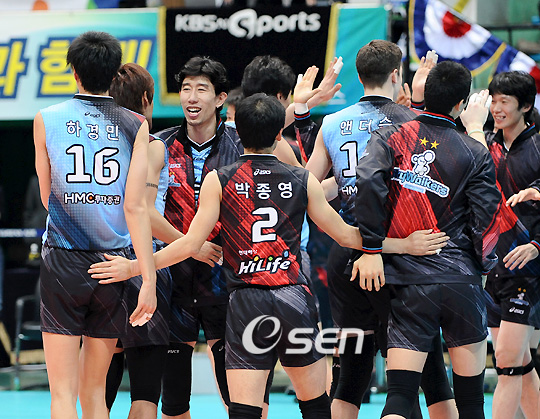 'NH농협2008~2009 V-리그' 대한항공과 현대캐피탈 경기가 17일 인천 도원실내체육관에서 열렸다. 현대캐피탈이 3-1 승리를 거두며 1위로 올라섰다. 경기 종료 후 현대캐피탈 선수들이 승리의 기쁨을 나누고 있다./인천=김영민 기자 ajyoung@osen.co.kr 온라인으로 받아보는 스포츠 신문, 디지털 무가지 OSEN Fun&Fun, 매일 3판 발행