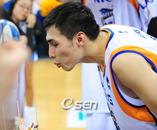 '2008-2009 동부 프로미 프로농구' 안양 KT&G와 전주 KCC의 경기가 17일 안양실내체육관에서 벌어졌다. 이 날 경기에서 KT&G는 KCC와 경기서 마퀸 챈들러(28득점, 11리바운드)의 활약에 힘입어 88-82로 승리했다. 경기를 마치고 간단히 열린 생일 파티에서 KT&G 주희정이 케이크의 촛불을 끄고 있다./안양=민경훈 기자 rumi@osen.co.kr 온라인으로 받아보는 스포츠 신문, 디지털 무가지 OSEN Fun&Fun, 매일 3판 발행