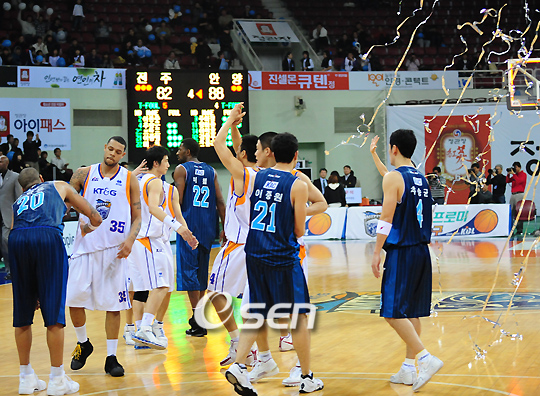 '2008-2009 동부 프로미 프로농구' 안양 KT&G와 전주 KCC의 경기가 17일 안양실내체육관에서 벌어졌다. 이 날 경기에서 KT&G는 마퀸 챈들러(28득점, 11리바운드)의 활약에 힘입어 KCC에게 88-82로 승리했다. 경기가 끝나며 축포가 터지고 있다./안양=민경훈 기자 rumi@osen.co.kr 온라인으로 받아보는 스포츠 신문, 디지털 무가지 OSEN Fun&Fun, 매일 3판 발행