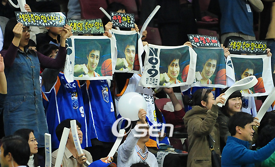 '2008-2009 동부 프로미 프로농구' 안양 KT&G와 전주 KCC의 경기가 17일 안양실내체육관에서 벌어졌다. 이 날 경기에서 KT&G는 마퀸 챈들러(28득점, 11리바운드)의 활약에 힘입어 KCC에게 88-82로 승리했다. 응원석에서 KT&G 팬들이 이 날 생일을 맞은 KT&G 주희정을 축하하고 있다./안양=민경훈 기자 rumi@osen.co.kr 온라인으로 받아보는 스포츠 신문, 디지털 무가지 OSEN Fun&Fun, 매일 3판 발행