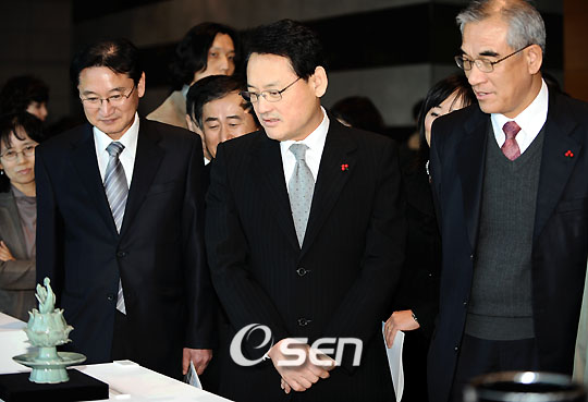 문화관광체육부가 주최하고 한국공예문화진흥원이 주관한 ‘백혈병 환우 돕기 한국공예품 자선공매’ 행사가 18일 오후 서울 용산구 서빙고로 국립중앙박물관 대강당에서 열렸다. 손지창의 사회로 진행된 이날 행사에는 유인촌 문화관광체육부 장관과 한국백혈병환우회 홍보대사로 활동하고 있는 서단비가 참석했고 주요 무형문화재 장인들이 직접 만든 작품 11점 등 44점의 작품들이 경매에 출품됐다. 유인촌 문화관광체육부 장관이 행사 관계자들과 함께 경매 출품작들을 둘러보고 있다. /강희수 기자 100c@osen.co.kr 온라인으로 받아보는 스포츠 신문, 디지털 무가지 OSEN Fun&Fun, 매일 3판 발행