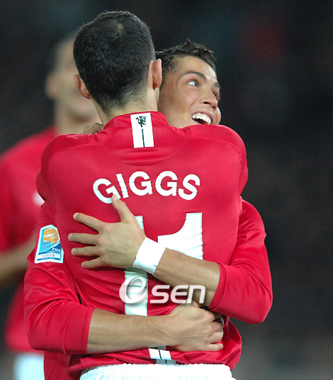 '2008 FIFA 클럽 월드컵' 박지성이 활약하고 있는 맨체스터 유나이티드와 감바 오사카의 준결승 경기가 18일 요코하마 닛산스타디움에서 벌어졌다. 전반 막판 맨유 호나우두가 팀의 두번째 골을 넣고 긱스와 포옹을 하고 있다./요코하마=송석린 객원기자song@osen.co.kr 온라인으로 받아보는 스포츠 신문, 디지털 무가지 OSEN Fun&Fun, 매일 3판 발행