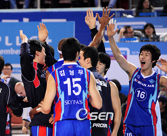 대한항공이 LIG손해보험을 상대로 대역전 드라마를 썼다. 대한항공은 20일 구미 박정희체육관에서 열린 NH농협 2008-2009 V리그 LIG손해보험과의 2라운드 경기에서 세트스코어 3-2(17-25 18-25 27-25 25-21 16-14)로 승리를 거뒀다. 세트스코어 0-2로 뒤지던 3세트에서 20-23까지 지고 있었지만 집중력을 발휘해 3세트를 챙긴 대한항공은 그 기세를 앞세워 당황한 LIG손해보험을 상대로 스파이크를 내뿜으며 승리했다. 특히 5세트에서 세터 한선수는 김요한의 공격을 막아내며 귀중한 득점을 기록했고 이어 진상헌, 강동진의 블로킹 득점으로 LIG손해보허 기세를 눌렀다. 이어 강동진의 득점과 상대 실책으로 경기를 마무리지었다. 수비에서 좋은 모습을 보인 장광균은 19득점을 기록하며 팀 승리를 이끌었고 신영수도 17득점을 올렸다. 반면 다 잡았던 승리를 놓친 LIG손해보험은 김요한, 이경수, 카이 등의 활약이 컸지만 위기관리 능력 부족으로 패했다. 그러나 LIG손해보험은 1세트부터 블로킹으로 대한항공의 좌우쌍포를 막아서며 대한항공을 몰아붙었다. 황동일, 김요한이 각각 칼라와 김학민의 스파이크를 가로막으며 10-7을 만들었다. 김요한의 백어택으로 팀의 분위기를 끌어올렸고 결국 김요한의 서브 득점으로 25-17로 완벽하게 세트를 챙겨갔다. 2세트 들어 이경수는 블로킹 득점으로 다시 기선 제압에 나섰다. 김요한도 강서브로 5-3을 만들며 대한항공을 몰아붙었다. 카이도 장광균의 공격을 가로막으면서 15-12로 점수차를 벌렸다. 김요한의 백어택이 대한항공 코트에 내리 꽂히면서 세트스코어 2-0을 만들었다. 범실이 많은 대한항공은 신영수와 장광균으로 수비를 강화하고 공격의 활로를 뚫으려고 했다. 하지만 3세트에도 LIG 손해보험의 블로킹은 대한항공의 날개를 꺾었고 하현용은 칼라와 신영수의 공격을 막으며 추격하려는 대한항공에 찬물을 끼얹었다. 그러나 경기를 끝낼 수 있는 결정적인 순간 황동일과 이경수의 실책이 잇따라 나오면서 23-23 동점을 허용했고 카이의 백어택까지 나가면서 한 세트를 내줬다. 살아난 대한항공은 4세트에서 신영수와 장광균의 활약으로 살아났다. 강동진도 시간차 등으로 득점을 보탰고 진상헌은 카이의 백어택을 가로 막으며 분위기를 완전히 대한항공 쪽으로 가져왔다. 결국 5세트에서 대한항공은 14-14서 강동진의 오픈 공격이 성공된 후 장광균, 한선수의 디그로 상대 공격을 막아낸 후 카이의 실책이 나오면서 역전 드라마에 마침표를 찍었다. 7rhdwn@osen.co.kr 온라인으로 받아보는 스포츠 신문, 디지털 무가지 OSEN Fun&Fun, 매일 3판 발행