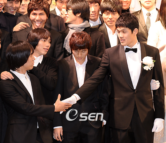 박주영(23, AS 모나코)이 리그 도중 정성룡(23, 성남 일화)의 결혼식에 참석했다. 박주영은 20일 오후 서울 반포동 센트럴시티 밀레니엄홀에서 열린 정성룡-임미정 커플의 결혼식에 깜짝 등장했다. 리그 도중이라 그의 등장은 놀라운 일이었다. 박주영의 소속팀 모나코는 오는 22일 새벽 루이 2세 스타디움에서 보르도와 리그 19라운드 경기를 앞두고 있는 상황이다. 하지만 박주영은 지난 14일 발렌시앙과의 경기를 앞두고 엉덩이 부상을 당하면서 결장했다. 이로 인해 박주은 예정보다 빨리 한국에 들어와 동계 휴식을 취하는 것으로 보인다. 박주영은 결혼식 내내 '조기 귀국'에 대해 묵묵부답으로 일관했고 프랑스 리그 1은 이번 라운드를 끝으로 내년 1월 11일까지 휴식에 들어간다. 7rhdwn@osen.co.kr 박주영이 결혼식 단체 기념 촬영 때 정성룡과 악수를 나누고 있다./민경훈 기자 rumi@osen.co.kr 온라인으로 받아보는 스포츠 신문, 디지털 무가지 OSEN Fun&Fun, 매일 3판 발행