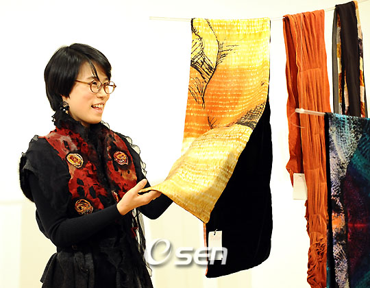 상명대학교 섬유디자인 브랜드 ‘파비스트’가 올해로 8년째를 맞아 COEX 디자인 갤러리에 입점하는 등 기세를 떨치고 있다. ‘파비스트’ 소속의 최연지 수석 디자이너가 20일 ‘Fabist Show 2008’이 열리고 있는 서울 동숭동 상명대학교 예술-디자인센터 갤러리에서 참여 작품들을 소개하며 활짝 웃고 있다. /강희수 기자 100c@osen.co.kr 온라인으로 받아보는 스포츠 신문, 디지털 무가지 OSEN Fun&Fun, 매일 3판 발행