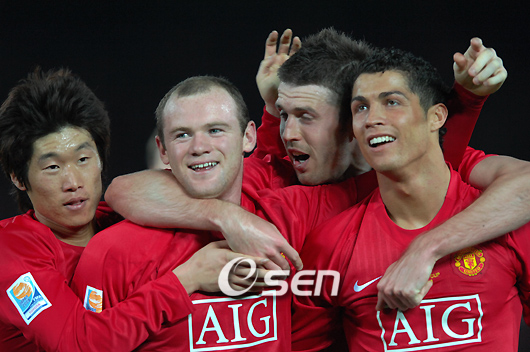 박지성이 소속된 맨체스터 유나이티드와 리가 데 키토의 '2008 FIFA 클럽 월드컵' 결승전이 21일 일본 요코하마 닛산스타디움에서 벌어졌다. 후반 호나우두의 어시스트를 골로 연결한 루니가 박지성과 호나우두의 축하를 받고 있다. /요코하마=송석린 객원기자song@osen.co.kr 온라인으로 받아보는 스포츠 신문, 디지털 무가지 OSEN Fun&Fun, 매일 3판 발행