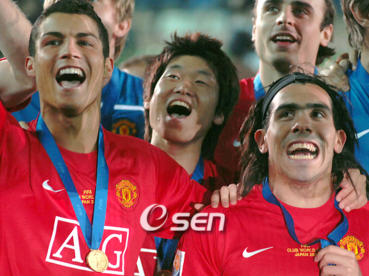 박지성이 풀타임 활약한 맨체스터 유나이티드가 21일 요코하마 닛산스타디움서 벌어진 '2008 FIFA 클럽 월드컵' 결승전서 후반 호나우두의 어시스트를 받은 루니의 결승골로 리가 데 키토에 1-0으로 승리, 사상 최초로 우승을 차지했다. 박지성이 호나우두 테베즈와 함께 우승 세리머니를 펼치고 있다./요코하마=송석린 객원기자song@osen.co.kr 온라인으로 받아보는 스포츠 신문, 디지털 무가지 OSEN Fun&Fun, 매일 3판 발행