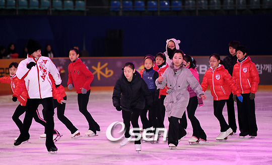 피겨요정 김연아가 오는 25일 열리는 'KB국민은행과 함께 하는 김연아의 에인절스 온 아이스(Angels on Ice) 2008' 자선 아이스쇼을 앞두고 24일 목동아이스링크에서 공개 연습및 기자회견을 가졌다. 김연아가 원더걸스의 'Nobody'에 맞춰 파트너인 조니 위어와 함께 피겨 꿈나무들과 연습하고 있다./김영민 기자ajyoung@osen.co.kr 온라인으로 받아보는 스포츠 신문, 디지털 무가지 OSEN Fun&Fun, 매일 3판 발행