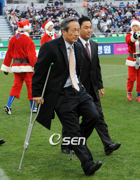 올해로 6회째를 맞는 홍명보 장학재단의 '하나은행과 함께 하는 SHARE THE DREAM FOOTBALL MATCH 2008'가 25일 오후 서울 상암월드컵경기장에서 열렸다. 경기 전 정몽준 대한축구협회장이 목발을 짚고 경기장에 나오고 있다./상암=윤민호 기자ymh@osen.co.kr 온라인으로 받아보는 스포츠 신문, 디지털 무가지 OSEN Fun&Fun, 매일 3판 발행