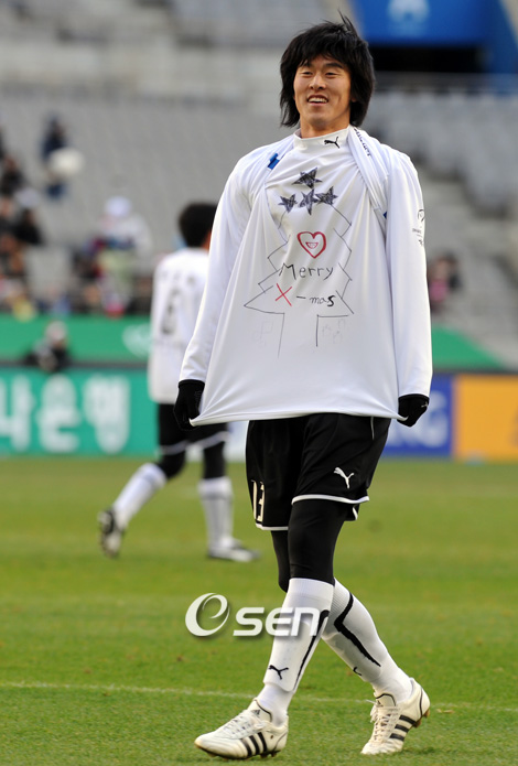 올해로 6회째를 맞는 홍명보 장학재단의 '하나은행과 함께 하는 SHARE THE DREAM FOOTBALL MATCH 2008'가 25일 오후 서울 상암월드컵경기장에서 열렸다. 후반 사랑팀 서동현이 골을 넣고 셔츠에 그린 크리스마스 트리를 보여 주고 있다./상암=윤민호 기자ymh@osen.co.kr 온라인으로 받아보는 스포츠 신문, 디지털 무가지 OSEN Fun&Fun, 매일 3판 발행