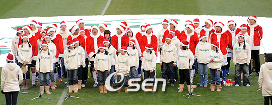 올해로 6회째를 맞는 홍명보 장학재단의 '하나은행과 함께 하는 SHARE THE DREAM FOOTBALL MATCH 2008'가 25일 오후 서울 상암월드컵경기장에서 열렸다. 하프타임 때 진행된 3만 산타 캐롤 대합창 기네스 기록 도전에 선수들도 동참하고 있다./상암=윤민호 기자ymh@osen.co.kr 온라인으로 받아보는 스포츠 신문, 디지털 무가지 OSEN Fun&Fun, 매일 3판 발행