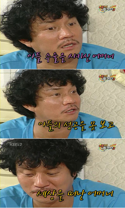 쿨의 김성수(40)가 돌아가신 어머니에 대한 모정을 털어놓으며 눈물을 보였다. 25일 KBS 2TV ‘해피투게더’에 손윗동서인 배우 공형진과 함께 출연한 김성수는 추억의 물건으로 토크를 펼치는 ‘캐비넷 토크’ 코너에서 “어릴 때 만화영화 ‘황금박쥐’를 좋아했다”고 말문을 열었다. 김성수는 “동네 친구들과 옥상에 올라가 놀이를 하던 중 발을 헛디뎌서 옥상에 떨어졌다. 이마에 크게 상처가 나서 피가 철철 났다”며 “당시 어머니께서 나를 업고 병원으로 뛰어갔다”고 기억을 떠올렸다. 김성수에 따르면 당시 집안 사정이 여의치 않았고, 병원비가 없어 수술을 못할 상황까지 이르렀다고. 그는 “어머니께서 ‘아이만 먼저 살려달라. 나중에 병원비는 꼭 갚겠다’고 말해 수술까지 잘하고 퇴원했다”며 말을 이었다. 김성수는 “이후 아이들에게서 흉터와 상처 때문에 놀림 받았고, 매일 사고치고 어머니 속을 썩였다. 세월이 흘러 형에게서 어머니가 결혼반지로 수술을 하게 한 것을 알게 됐다”고 털어놓았다. 그는 “사실을 알고 난 뒤 부끄러웠다. 그때 깨우침을 얻어 돈을 벌어야겠다고 생각했다. 예쁜 반지를 어머니에게 선물해야겠다고 생각했다. 하지만 어머니께서는 내가 성공하는 것을 못 보시고 돌아가셨다”며 참고 있던 눈물을 흘렸다. 김성수는 이어 “반지만 보면 엄마 생각이 난다”며 “효도는 못했지만 부모님께서 하늘나라에서 웃으실 거라 생각한다”며 말을 마무리했다. yu@osen.co.kr 방송 캡처. 온라인으로 받아보는 스포츠 신문, 디지털 무가지 OSEN Fun&Fun, 매일 3판 발행