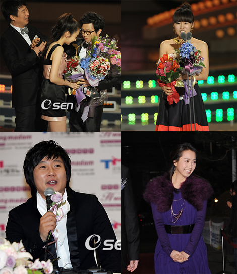 박성광, 김경아, 이수근, 이지애 아나운서가 2008 ‘KBS 연예대상’ 신인상의 주인공으로 선정됐다. 27일 오후 10시 서울 여의도 KBS 별관에서 생방송으로 진행된 2008 ‘KBS 연예대상’에서 박성광 김경아 이수근 이지애 아나운서가 각각 코미디, 쇼오락 부문 MC 남녀 신인상 수상자로 선정됐다. 박성광은 ‘개그콘서트 박대박’에서 소심한 MC로 주목 받았다. 시상자로 나온 소희에게 관심을 보이던 박성광은 “지선이가 더 예쁘다. 작년에도 (신인상) 후보에 올랐고 한 여자에게 고백을 받았다. 그리고 나머지 여자들에게 버림받았다”며 재치있는 소감을 남겼다. 그리고 “10년 지기 친구 영진아 사랑한다”며 파트너 박영진과 기쁨을 나눴다. 김경아는 ‘개그콘서트 너무좋아’에서 엉뚱하고 애교 많은 캐릭터로 많은 웃음을 선사했다. 수상 기쁨에 눈물을 글썽이던 김경아는 “내년에 데뷔 4년 차다. 작년 시상식 때는 집에서 혼자 맥주 마시면서 시상식 봤는데 이렇게 소중한 자리에서 상 주셔서 감사하다. 저를 개그맨으로 뽑아주신 KBS 감독님들에게 감사하고, 나의 좋은 파트너 태복이에게 너무 고맙다”며 제작진과 동료 개그맨들에게 감사의 말을 전했다. 이수근은 ‘상상플러스 시즌2’ ‘해피선데이-1박 2일’에서 개그맨이 아닌 진행자로서 새로운 모습을 선보였다. “강호동 선배님을 보면서 MC가 되길 꿈궜는데 신인상을 받았으니 가능성을 봐 주신거라 생각한다. 가족에게 감사하고 함께 프로그램을 만든 제작진에게 감사하다”고 전했다. 1박 2일 멤버들에게도 고마움을 전하던 이수근은 “훌륭한 뱃사공은 거친 파도를 통해 만들어진다고 해 준 강호동 선배님 감사하다”며 애틋한 마음을 전했다. KBS 32기 아나운서 이지애는 ‘상상플러스 시즌2’에서 안방마님으로 활약했다. 이지애 아나운서는 “매주 ‘상상플러스’ 제작진은 매주 ‘플러스’냐, ‘상상더하기’냐를 두고 고민한다. 아름다운 우리 말을 위해 노력하는데, 격려하라고 주신 상이라 생각한다. 2008년 나에 대한 많은 이야기가 있었는데 감사의 말로 한 해를 마무리 할 수 있어 기쁘다”고 소감을 남겼다. 한편 이날 신인상 후보로는 박성광 박영진 송준근 양상국(이하 코미디 신인상 남자), 김경아 장도연 허미영(이하 코미디 신인상 여자), 김지훈 유세윤 이수근 지현우(이하 쇼오락 MC 신인상 남자), 서인영 이선영 아나운서 이지애 아나운서(이하 쇼오락 MC 신인상 여자)가 치열한 경합을 벌였다. miru@osen.co.kr 민경훈 기자