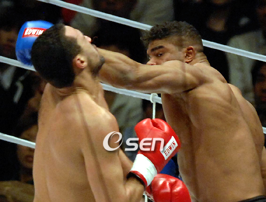 종합격투기 파이터 알리스타 오브레임(28)이 입식타격기에도 탁월한 재능이 있음을 과시했다. 오브레임은 31일 오후 일본 사이타마 슈퍼아레나에서 열린 'K-1 다이너마이트 2008'에서 입식타격기 룰로 '악동' 바다 하리를 1라운드 2분 7초만에 KO로 제압하는 이변을 연출했다. 자신에게 불리한 룰로 경기를 치루는 상황에서도 오브레임의 공세는 매서웠다. 시작과 함께 강력한 왼손 훅으로 하리를 흔든 오브레임은 지속적인 타격으로 승기를 잡아갔다. 오브레임은 클린치 상황에서 왼쪽 니킥을 성공시키면서 첫 번째 다운을 빼앗았다. 기세가 오른 오브레임은 간신히 파이팅 자세를 취한 하리에게 다시 한 번 위력적인 왼손 훅을 작렬시키면서 두 번째 다운과 함께 승리를 거머쥐었다. stylelomo@osen.co.kr 오브레임이 하리의 안면에 강타를 넣고 있다. / 사이타마=송석린 객원기자.