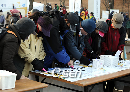 “2009년에는 인천으로 오세요.” ‘2009 인천 세계도시축전’의 성공적인 개최를 기원하고 ‘2009 인천 방문의 해’의 비전을 선포하는 ‘마니산 해맞이 행사’가 기축년 새해 첫 날 오전, 인천광역시 강화군 화도면 마니산 입구 광장에서 성대하게 열렸다. 홍종일 인천 정무부시장, 안덕수 강화군수, 구경회 강화군의회 의장, 박희경 인천 시의원 등 인천시-강화군 관계자들은 마니산 등산객, 시민 등과 함께 신령스러운 기운이 넘친다는 마니산에서 인천 및 대한민국의 번영과 각 가정의 행복과 건강을 빌었다. 해맞이 행사의 하나로 준비된 즉석행운권 이벤트 ‘팔미도를 찾아라’에 등산객들이 몰려 들어 경품권을 긁고 있다. /강화=강희수 기자 100c@osen.co.kr