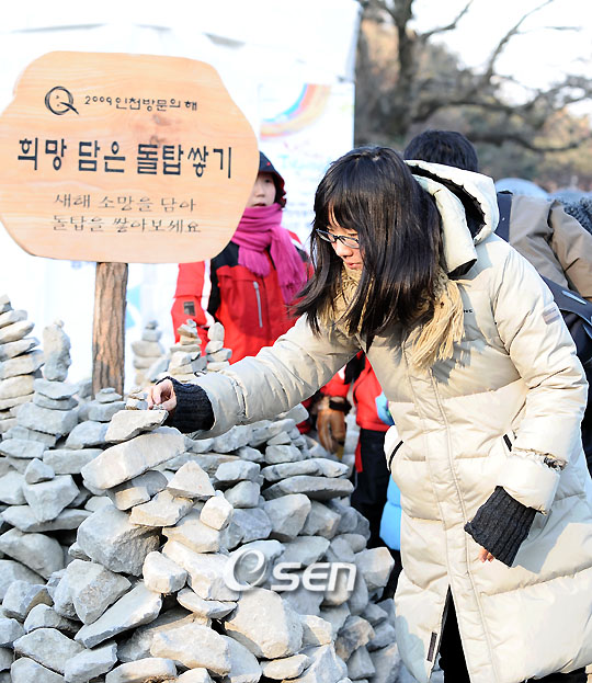 “2009년에는 인천으로 오세요.” ‘2009 인천 세계도시축전’의 성공적인 개최를 기원하고 ‘2009 인천 방문의 해’의 비전을 선포하는 ‘마니산 해맞이 행사’가 기축년 새해 첫 날 오전, 인천광역시 강화군 화도면 마니산 입구 광장에서 성대하게 열렸다. 홍종일 인천 정무부시장, 안덕수 강화군수, 구경회 강화군의회 의장, 박희경 인천 시의원 등 인천시-강화군 관계자들은 마니산 등산객, 시민 등과 함께 신령스러운 기운이 넘친다는 마니산에서 인천 및 대한민국의 번영과 각 가정의 행복과 건강을 빌었다. 행사장을 찾은 시민들이 ‘희망 담은 돌탑 쌓기’ 마당에서 정성스레 돌탑을 쌓으며 새해 소망을 빌고 있다. /강화=강희수 기자 100c@osen.co.kr