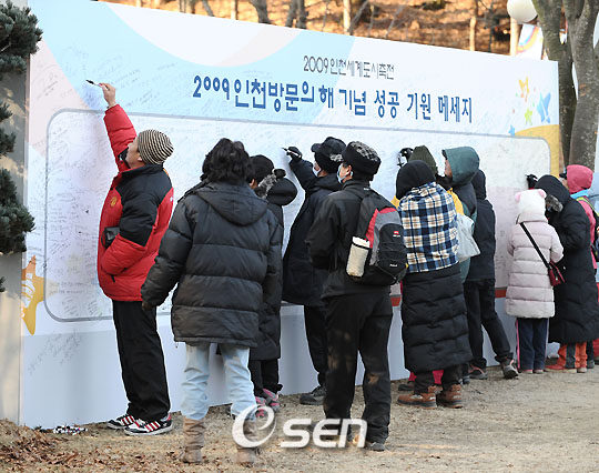 “2009년에는 인천으로 오세요.” ‘2009 인천 세계도시축전’의 성공적인 개최를 기원하고 ‘2009 인천 방문의 해’의 비전을 선포하는 ‘마니산 해맞이 행사’가 기축년 새해 첫 날 오전, 인천광역시 강화군 화도면 마니산 입구 광장에서 성대하게 열렸다. 홍종일 인천 정무부시장, 안덕수 강화군수, 구경회 강화군의회 의장, 박희경 인천 시의원 등 인천시-강화군 관계자들은 마니산 등산객, 시민 등과 함께 신령스러운 기운이 넘친다는 마니산에서 인천 및 대한민국의 번영과 각 가정의 행복과 건강을 빌었다. 등산객과 시민들이 행사장에 마련된 인천 방문의 해 성공기원 메시지 벽보판에 각자의 소망을 적고 있다. /강화=강희수 기자 100c@osen.co.kr