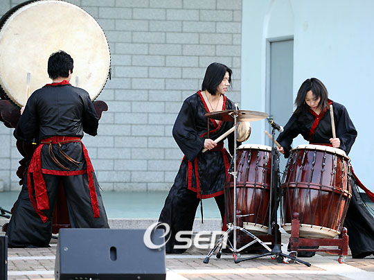“2009년에는 인천으로 오세요.” ‘2009 인천 세계도시축전’의 성공적인 개최를 기원하고 ‘2009 인천 방문의 해’의 비전을 선포하는 ‘마니산 해맞이 행사’가 기축년 새해 첫 날 오전, 인천광역시 강화군 화도면 마니산 입구 광장에서 성대하게 열렸다. 홍종일 인천 정무부시장, 안덕수 강화군수, 구경회 강화군의회 의장, 박희경 인천 시의원 등 인천시-강화군 관계자들은 마니산 등산객, 시민 등과 함께 신령스러운 기운이 넘친다는 마니산에서 인천 및 대한민국의 번영과 각 가정의 행복과 건강을 빌었다. 인천 방문의 해를 축하하는 공연단의 대북 퍼포먼스가 열리고 있다. /강화=강희수 기자 100c@osen.co.kr