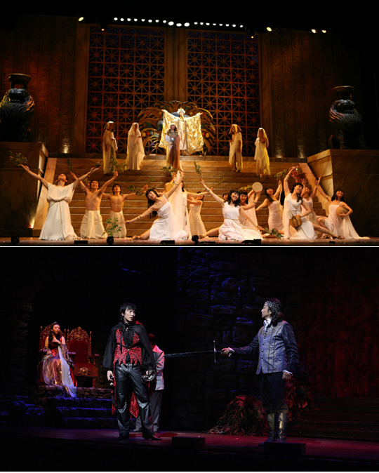 점점 대형화 되어가고 있는 한국 뮤지컬 무대가 고대의 화려함이 더해져 볼거리가 풍성해 졌다. 고대를 배경으로 한 뮤지컬 ‘언약의 여정’ ‘클레오파트라’ ‘햄릿’ 등은 웅장한 무대 미술과 화려한 의상 등을 내세워 관객이 느낄 즐거움을 더했다. 2006년과 2007년에 이어 2009년 앙코르 공연을 갖는 뮤지컬 ‘언약의 여정’은 고대 이집트를 재현한 대형 세트와 화려한 의상으로 무대를 장악했다. 지난 작년 12월 20일 막이 오른 후 주말 이틀간 전회 매진을 기록해 눈길을 끌었다. 뮤지컬 ‘언약의 여정’은 감동적인 스토리, 아름다운 뮤직넘버뿐만 아니라 다양한 볼거리까지 갖춘 대형 창작뮤지컬로, 주인공 ‘케린’이 살고 있는 미국 LA의 어두운 슬럼가를 비롯해 성경 속 인물인 ‘요셉’이 머무는 왕궁과 감옥 등 고대 이집트를 재현한 대형 세트 등 웅장한 무대 미술과 장면 전환을 선보이며 관객들의 시선을 사로잡았다. 어린 시절 부모님의 죽음으로 마음에 상처를 입고 방황하던 10대 소녀 ‘케린’이 자신과 비슷한 아픔을 겪었던 성경 속 ‘요셉’의 이야기를 마음 깊이 받아들이고 희망을 찾아가는 내용을 다룬 뮤지컬 ‘언약의 여정’은 과거와 현재를 오가는 액자식 구성으로 현재의 대도시와 고대의 이집트 등 각기 다른 시간과 장소를 대비시켜 두 가지 메인 스토리로 구성했다. 이러한 내용을 시각적으로 잘 전달하기 위해 고대 이집트와 LA를 그대로 재현한 초대형 세트와 이집트 왕족들의 삶을 묘사하기 위한 200여벌의 의상들이 등장하는 뮤지컬 ‘언약의 여정’은 관객들에게 시각적인 화려함을 그대로 전달했다. 뮤지컬계 베테랑 배우 김선경과 가수 박지윤이 더블캐스팅 돼 화제를 모았던 뮤지컬 ‘클레오파트라’도 이집트와 로마를 배경으로 화려한 무대를 선보였다. 이집트 최후의 파라오 클레오파트라의 삶과 전설에 관한 스토리를 다룬 체코 뮤지컬 ‘클레오파트라’는 이집트와 로마시대의 재현을 위해 화려하면서도 우아한 의상과 무대장치들로 신비로운 볼거리를 제공하며 화려한 막을 내렸다. 숙명아트센터 씨어터 S에서 오픈런으로 공연되고 있는 뮤지컬 ‘햄릿-월드버전’은 11세기 덴마크 궁정의 화려함을 무대에 올렸다. 화려한 11세기 덴마크 궁정을 묘사한 거대 회전무대와 당대의 복식을 그대로 고증한 의상 등을 보는 재미를 더했다. 고대를 완벽하게 재현한 무대와 의상 등으로 무장한 뮤지컬들은 생생한 사운드와 신나는 안무까지 더해져 관객의 눈과 귀를 동시에 즐겁게 해 주목받는다. jin@osen.co.kr 뮤지컬 ‘언약의 여정’ ‘햄릿-월드버전’.