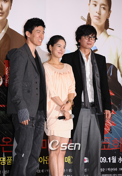 고우영 화백의 사극 만화를 드라마로 만든 MBC 수목드라마' 돌아온 일지매’ 제작발표회가 7일 오후 종로 서울극장에서 정일우,윤진서,김민종,정혜영,이계인,박철민 등 출연진이 참석한 가운데 열렸다. 격변하는 조선시대, 태어나자마자 매화가지 아래 버려졌던 갓난 아기가 평민들을 구하는 의적에서 나라의 운명을 수호하는 전설적인 영웅 일지매으로 다시 태어나는 이야기로 ‘종합병원2'의 후속이다. 축하 인사 찿아온 정혜영의 남편 션이 정혜영,김민종과 함께 취재진을 향해 포즈를 취하고 있다./김영민 기자ajyoung@osen.co.kr