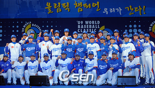 오는 3월 열리는 제 2회 월드베이스볼클래식(WBC) 대회의 국가대표팀 유니폼이 첫 선을 보였다. 8일 서울 신라호텔에서 열린 'WBC 국가대표 프레스 컨퍼런스'에서는 국가대표 32명 중 박찬호, 이승엽, 추신수, 김동주 4명을 제외한 28명의 선수와 김인식 대표팀 감독을 비롯한 코칭스태프 전원이 참석했다. WBC 아시아 담당인 짐 스몰 MLBI 부사장의 인사말로 시작된 이날 행사는 나이키가 새롭게 제작한 WBC 유니폼을 입고 선수들이 등장, 분위기를 한껏 띄웠다. 김인식 감독은 이날 대회 출전 출사표를 말해달라는 질문에 "한 번도 맞춰보지 않고 출사표를 던진다는 것이 우습기도 하다"면서 "아직 확답을 주지 않은 박찬호(필라델피아), 이승엽(요미우리) 등의 참가여부가 확정되면 달라지겠지만 그래도 현재 모여 있는 선수들과 코칭스태프가 힘을 합쳐 최선을 다하겠다"고 말했다. 특히 김 감독은 "엔트리 32명에 포함된 김동주가 참가할 수 없다는 최종 통보가 있었다"면서 "김동주를 대신해 한화 이범호를 새롭게 엔트리에 넣었으며 오는 16일 WBC에 제출하는 45명 엔트리에는 장성호를 추가로 뽑았다"고 밝혔다. 이어 그는 "박찬호는 필라델피아와 계약을 했지만 WBC 참석 여부는 아직 통보하지 않았다. 이승엽 역시 본인 개인사정으로 점점 희박해지고 있는 것 같다"면서도 여전히 박찬호와 이승엽이 참가해주리라는 희망의 끈을 놓치 않는 모습이었다. 선수단 대표로 나선 손민한(롯데)은 "2006년 1회 WBC 대회, 작년 베이징올림픽 때와 마찬가지로 다시 한 번 우리 선수단은 그 때 영광을 재현하겠다"면서 "이번에는 반드시 미국 땅에 우연이 아닌 실력으로 값진 태극기를 꽂고 돌아오겠다"고 각오를 드러냈다. WBC 대표팀은 오는 2월 14일 오후 5시 서울 리베라호텔에서 소집된 뒤 다음날인 15일 전지훈련지인 미국 하와이로 출국한다. 또 2월 22일에는 최종 엔트리를 제출할 예정이다. letmeout@osen.co.kr 2009 WBC(WORLD BASEBALL CLASSIC) 국가대표 출정식 및 유니폼 발표회가 8일 서울 장충동 신라 호텔에서 열렸다. 야구 대표팀과 코칭스텝이 기념촬영을 하고 있다./윤민호 기자ymh@osen.co.kr