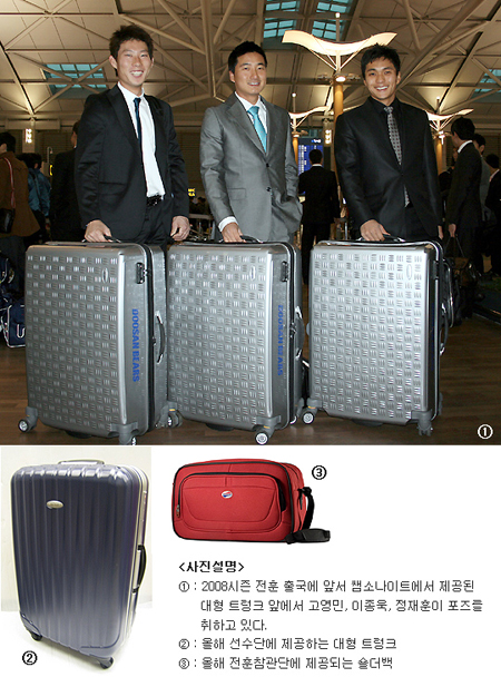 두산 베어스가 세계적인 여행 가방 전문업체와 손을 잡았다. 두산은 8일 보도자료를 통해 '쌤소나이트 코리아'와 업무협약을 체결, 시즌 중 공동 마케팅을 실시한다고 밝혔다. 이에 따르면 두산은 '쌤소나이트 코리아'로부터 전지훈련용 대형 트렁크 가방인 'Pallo ne Spinner 81cm' 50개와 전지훈련 참관단용 숄더백 'American Tourister A97' 40개를 지원받는다. 두산은 '쌤소나이트 코리아'에 시즌 중 팬북 광고를 비롯해 전광판 광고 및 홈페이지 배너광고 등 다양한 홍보 마케팅 툴을 제공하며 '쌤소나이트 코리아'는 두산 홈경기에 다양한 이벤트를 실시해 야구장을 찾는 팬들에게 색다른 즐거움을 선사할 예정이다. 두산 마케팅팀은 "작년에 이어 올해도 '쌤소나이트 코리아'와의 업무 제휴를 시작으로 팬서비스에 역량을 집중해 올 한해 야구장을 찾는 팬들에게 더욱 큰 즐거움을 드리도록 노력하겠다"는 입장을 밝혔다. letmeout@osen.co.kr 두산 베어스 제공.