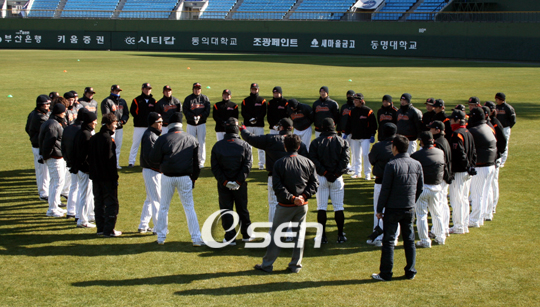 지난해 8년 만에 포스트시즌에 진출한 롯데 자이언츠가 올 시즌 한국시리즈 정상을 다짐했다. 롯데는 10일 오전 부산 사직구장에서 시무식을 가졌다. 이날 행사는 ▲국민의례 ▲대표이사 신년사 ▲비시즌 선수단 운영계획 ▲신인선수 반지 수여식 ▲우승 기원 케이크 절단식으로 진행됐다. 박진웅 대표 이사는 신년사를 통해 "선수들의 늠름한 모습을 보니 휴식 기간에 열심히 노력했다는 것을 느낄 수 있다"며 "지난해 8년 만에 4강에 진출하고 역대 최다 관중 돌파 등 겹경사를 누렸지만 지난해 성적에서 만족해서 안 된다"고 강조했다. 이어 그는 "올해 목표는 한국시리즈 우승이다. 선수들이 강한 자신감을 가져야 한다. 강한 자신감은 우승을 향한 최고의 원동력"이라고 힘줘 말하며 "시즌을 치르다보면 많은 어려움에 처할 수 있지만 위기를 극복한다면 좋은 결과를 거둘 수 있다"고 덧붙였다. 선수단은 오후 1시부터 첫 훈련에 나섰다. 박영태 수석 코치는 선수단 미팅을 통해 "지금의 멤버가 올 시즌을 이끌어 가야 한다. 해외 전훈 전 부상 당하지 않도록 주의해야 한다"고 말했다. 선수들은 러닝, 스트레칭, 캐치볼로 가볍게 몸을 푼 뒤 웨이트 트레이닝 등으로 훈련을 마쳤다. 한편 롯데 선수단은 4일 훈련 1일 휴식의 일정으로 사직구장에서 담금질에 나선 뒤 투수조는 21일, 야수조는 30일 사이판으로 1차 해외 전훈을 떠난다. what@osen.co.kr